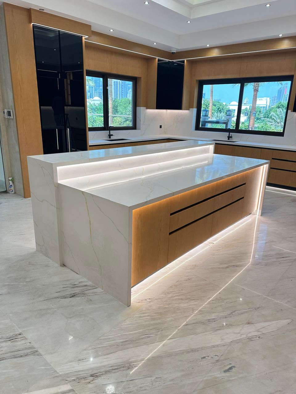 A collection of modern kitchen designs featuring sleek cabinetry, marble elements, and large windows, creating a bright and inviting space for cooking and entertaining.